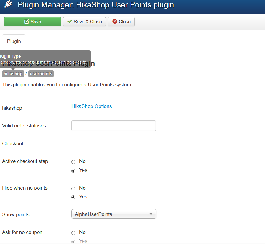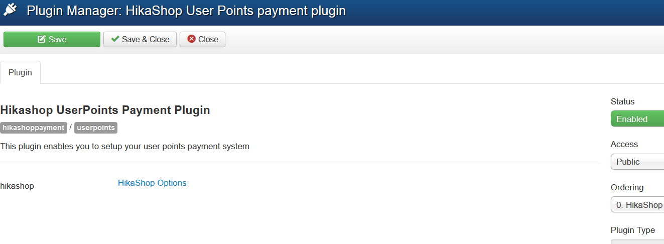 when going from the payment user point plugin(one.png) to the hikashop options get screen picture two (two.png)