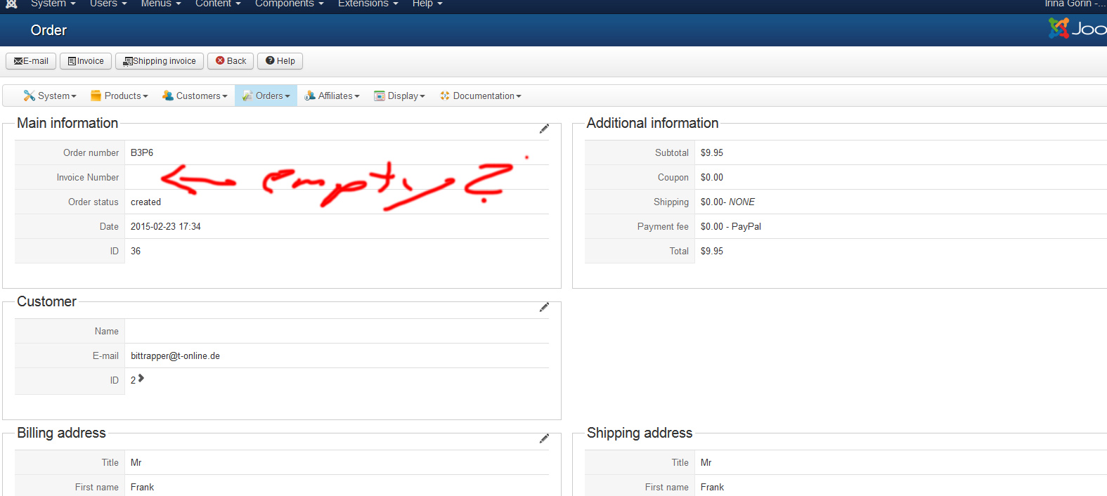 I checked the order-numbers at Hikashop and I wonder that they were all empty. It is only an idea but could this cause the problem? How can I fix it? Do you have another idea?