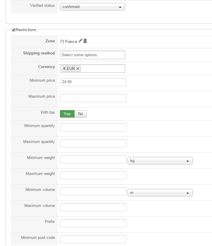I would like one minimum by default of 50€. It means for general customers, without coupons, the amount of the order has to be at least 50€. But in some case, thanks to a coupon, this minimum could be 25€.