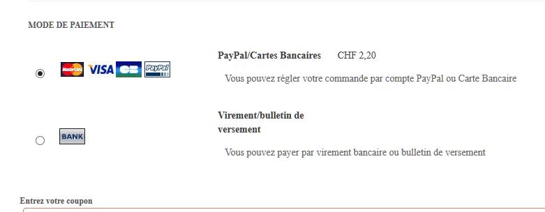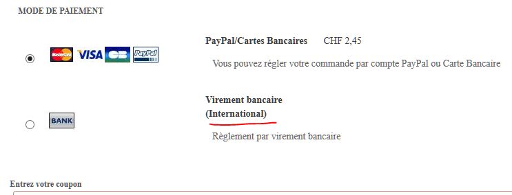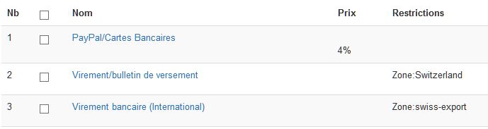 Je comprends donc mieux, mais il y a un nouveau problème : trois modes de règlement sont définis dans la boutique, PayPal pour tous les clients, un virement réservé aux résidents suisses, un autre virement international réservé aux résidents français ou belges (utilisant la gestion des zones). Or les trois modes sont disponibles dans la liste déroulante, alors que mon adresse simulée étant en Suisse, le mode de virement international pour les acheteurs hors Suisse ne devrait pas m'être proposé (j'ai pu le choisir et valider).