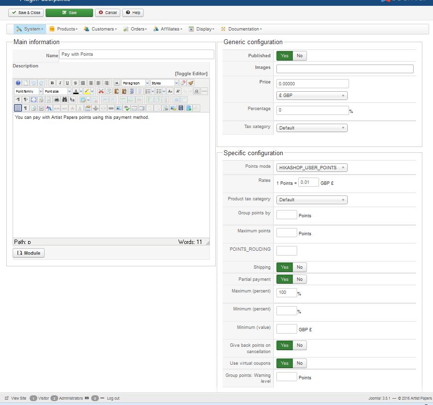 I've encountered some problems using Hikashop points plugin for payment. I am using the custom field method to grant users points via back end admin.