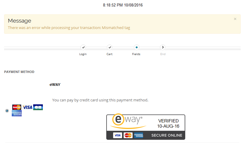 The error message "mismatched tags" is coming from the eWay payment platform.