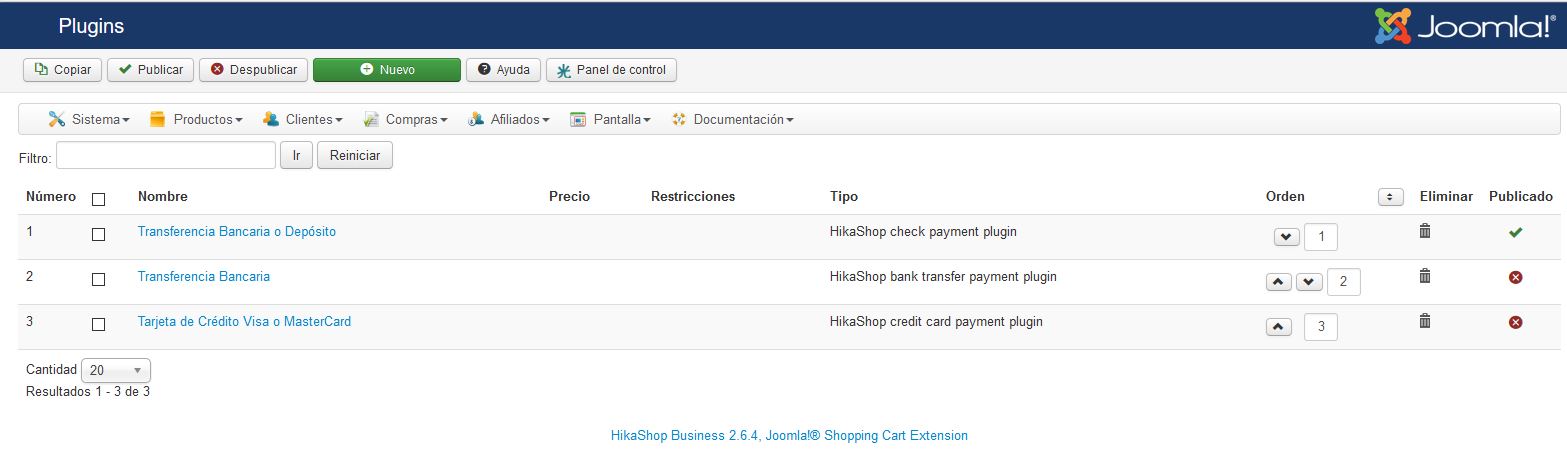 Even when the plugins of the payments method are installed and availables(hika1.JPG), it doesn't appears in the hikashops payments methods(hika2.JPG).