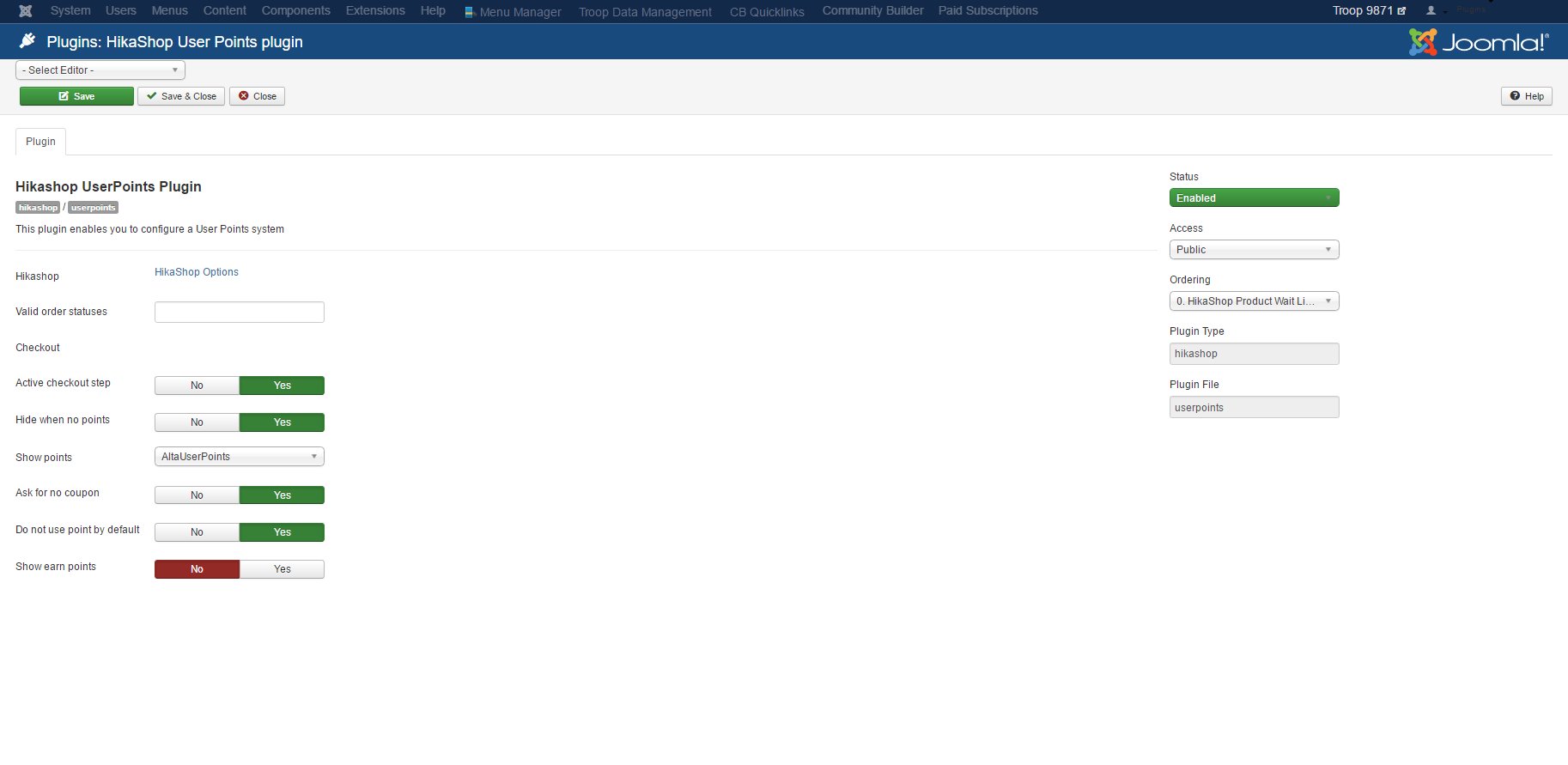 Please also note that both "user points" plugin (the hikashop one and the hikashoppayment one) must be published in order to let the full system work properly.