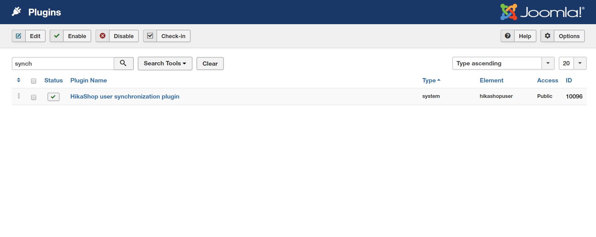 And I went to check in the Joomla plugins manager and I don't find the HikaShop user synchronization plugin.