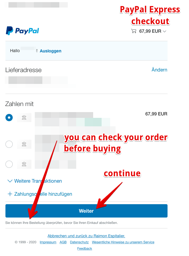 : customer clicks on the button ‚Continue‘ and then everything is payed but he expected that he can check my order