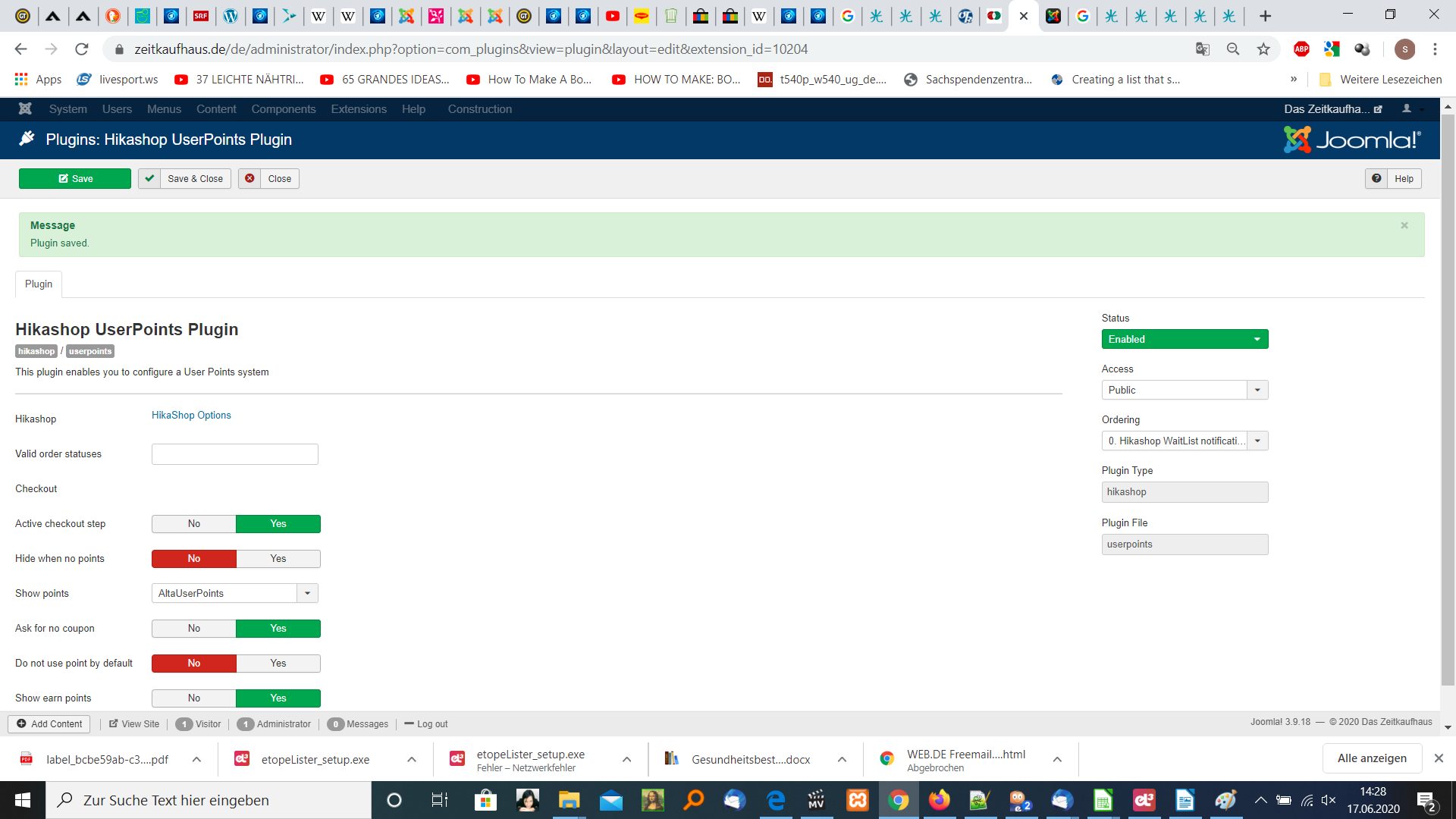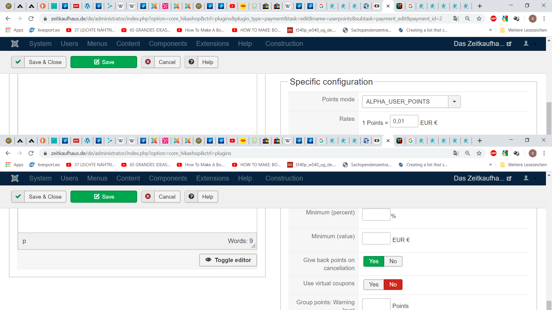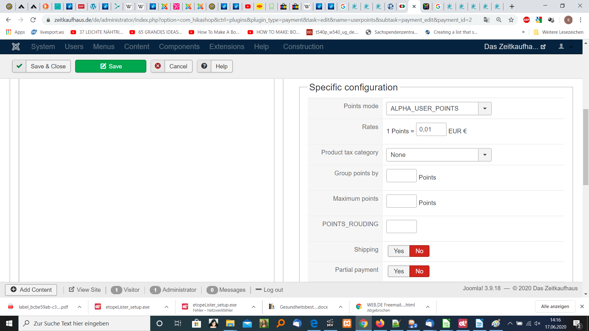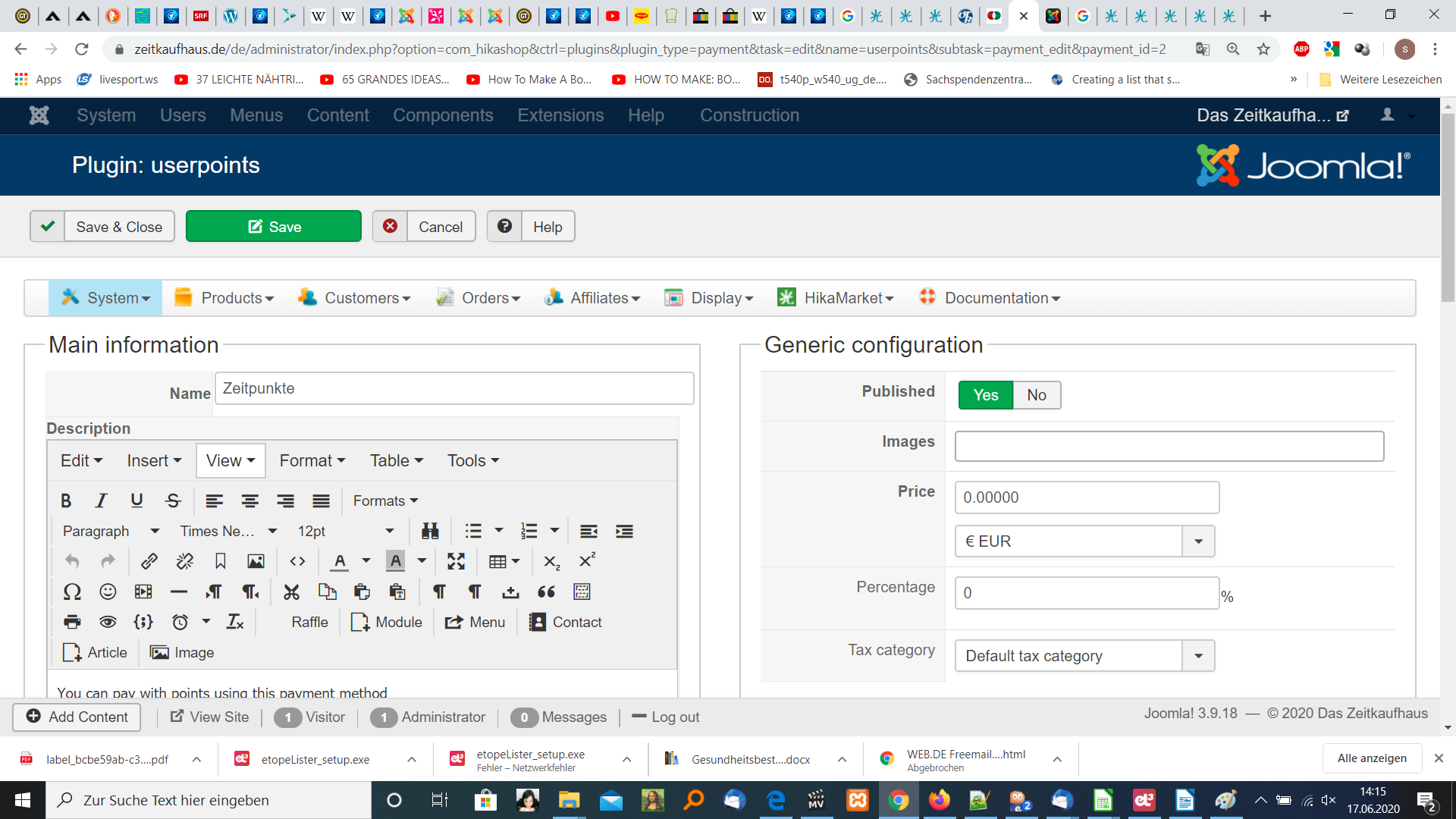 I got no success with hikashop, so I use now altauserpoints (1.1.14). I gave myself 51000 points to test buying in my shop. There is shown "You have 51000 points", but I can´t choose a payment methode. I attached some screenshots, maybe somebody fin something out....