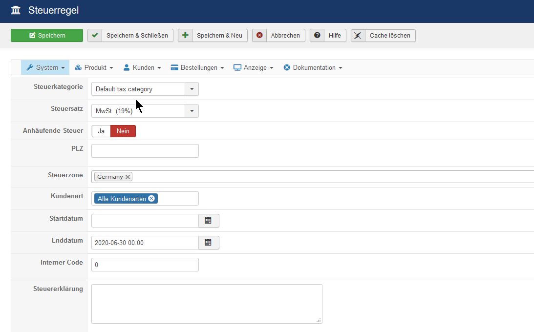 There was already an end date set but it is only showing the start date. Will the "MwSt. (19%)"-tax rule automatically disabled when the new rule kicks in tonight?