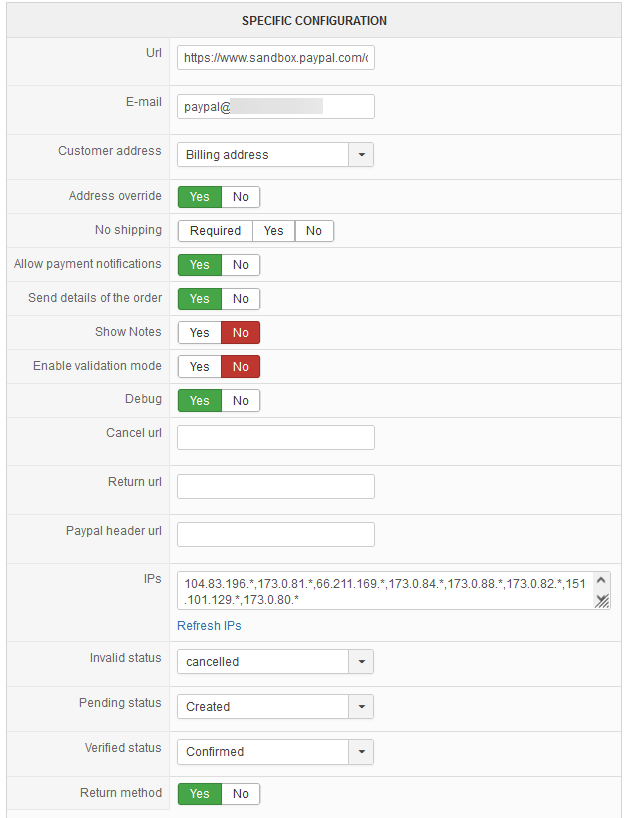 When using the sandbox, you need to enter in the "email" setting, the email address of the merchant account from your sandbox account and the customer email address from the customer account from your sandbox account.