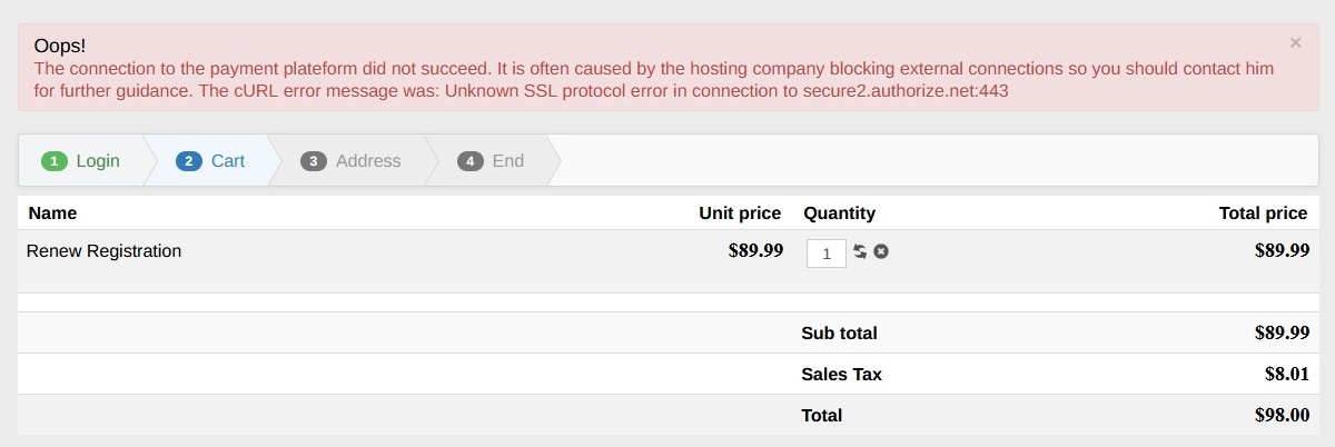 $this->app->enqueueMessage('The connection to the payment plateform did not succeed. It is often caused by the hosting company blocking external connections so you should contact him for further guidance. The cURL error message was: '.curl_error($request),'error');