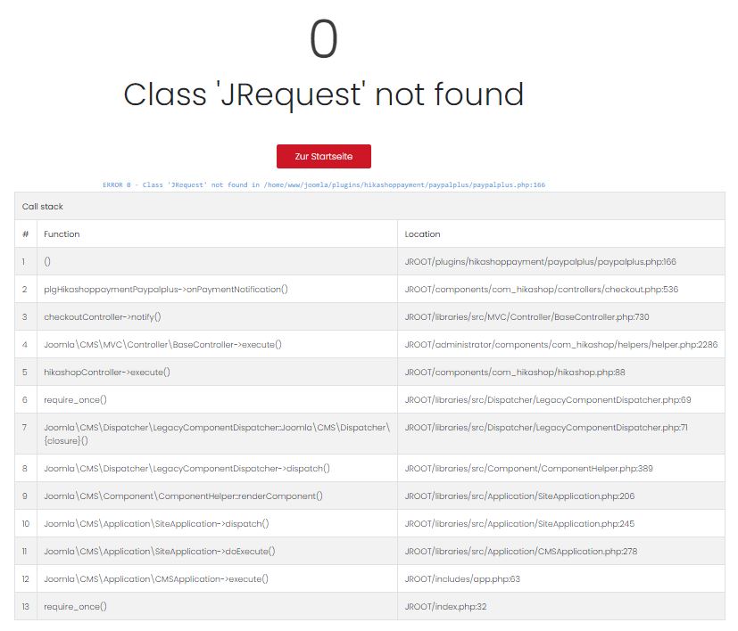 -- Error-message(debug-mod must be tuned on) -- : ERROR 0 - Class 'JRequest' not found in /home/www/joomla/plugins/hikashoppayment/paypalplus/paypalplus.php:166