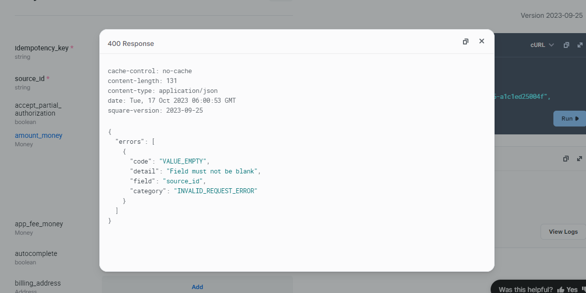 -- Error-message(debug-mod must be tuned on) -- : Square payment issue