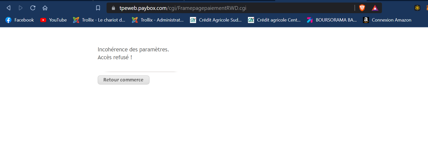 A part cela, le plugin doit fonctionné si il est configuré avec les bons identifiants. Donc par exemple, vérifier que vous n'utilisez pas les identifiants de sandbox (bac à sable) alors que l'option sandboxx de la méthode de paiement est désactivée et vice-versa et sinon vérifiez avec le support technique Marchand de votre banque pour voir ce qui ne va pas.