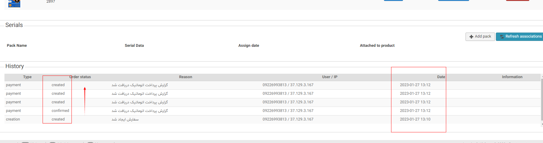 some times when some of my user purchase some product the order status change automatically to created after it is confirmed. please look at the attached picture: