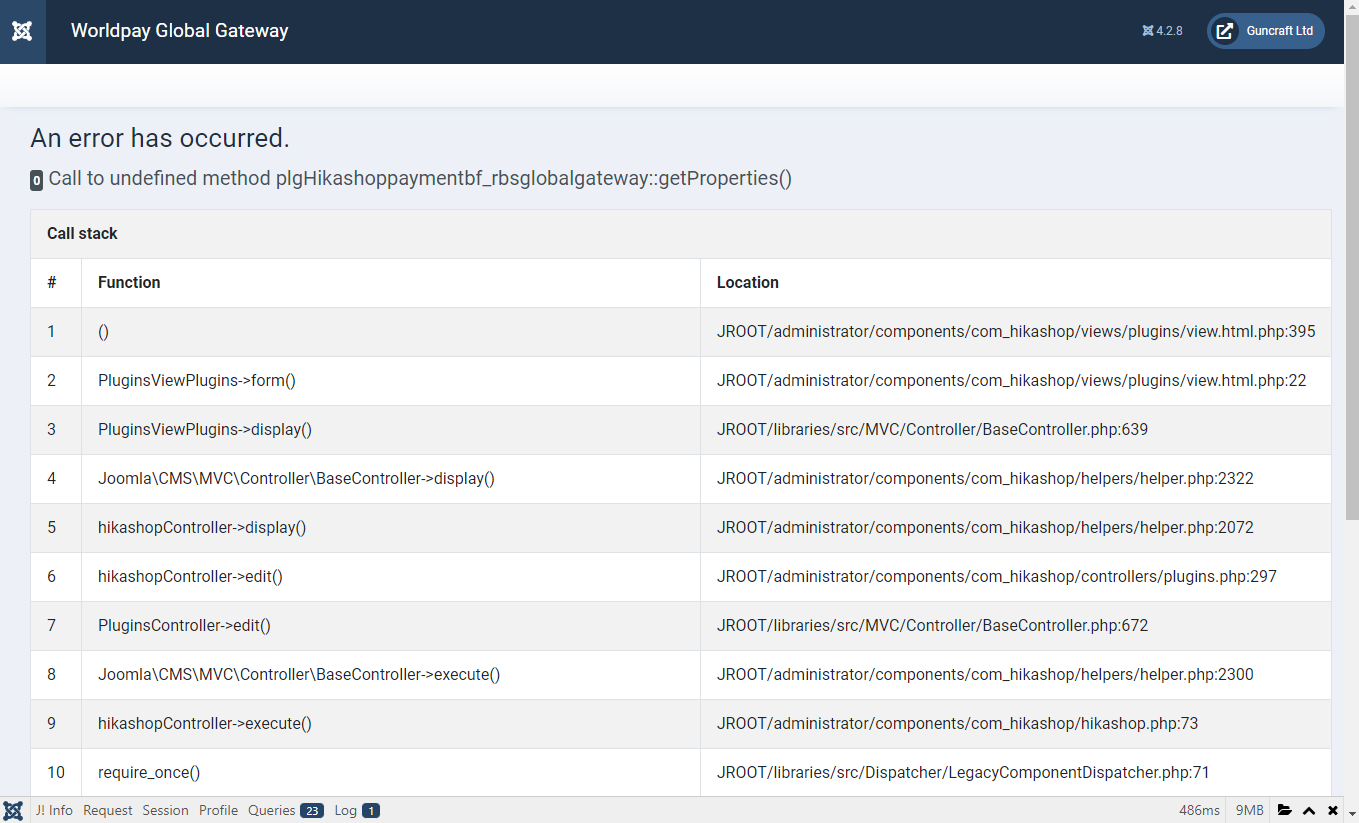 I'm setting up a new website with a new install of Hikashop and the Worldpay plugin (yes, its enabled) and I get a Call to undefined method error when clicking on the plugin name in the list of payment plugins after clicking on the New button in the payment methods screen.