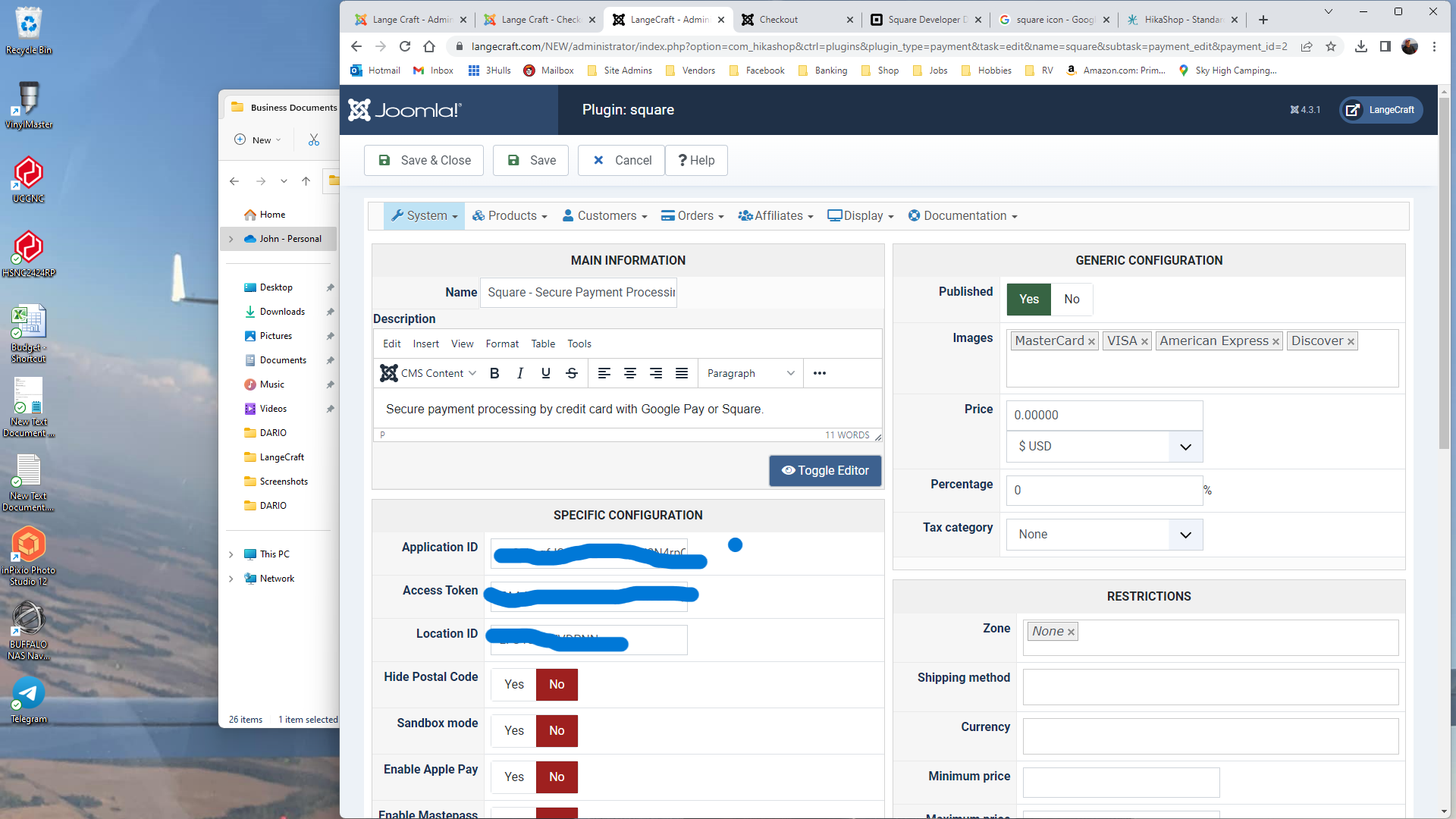 Installed, Enabled, and setup in Hikashop per documentation. Processed an order, it took me to a Checkout page, Input email address, CC number, expire and code and Zip Code