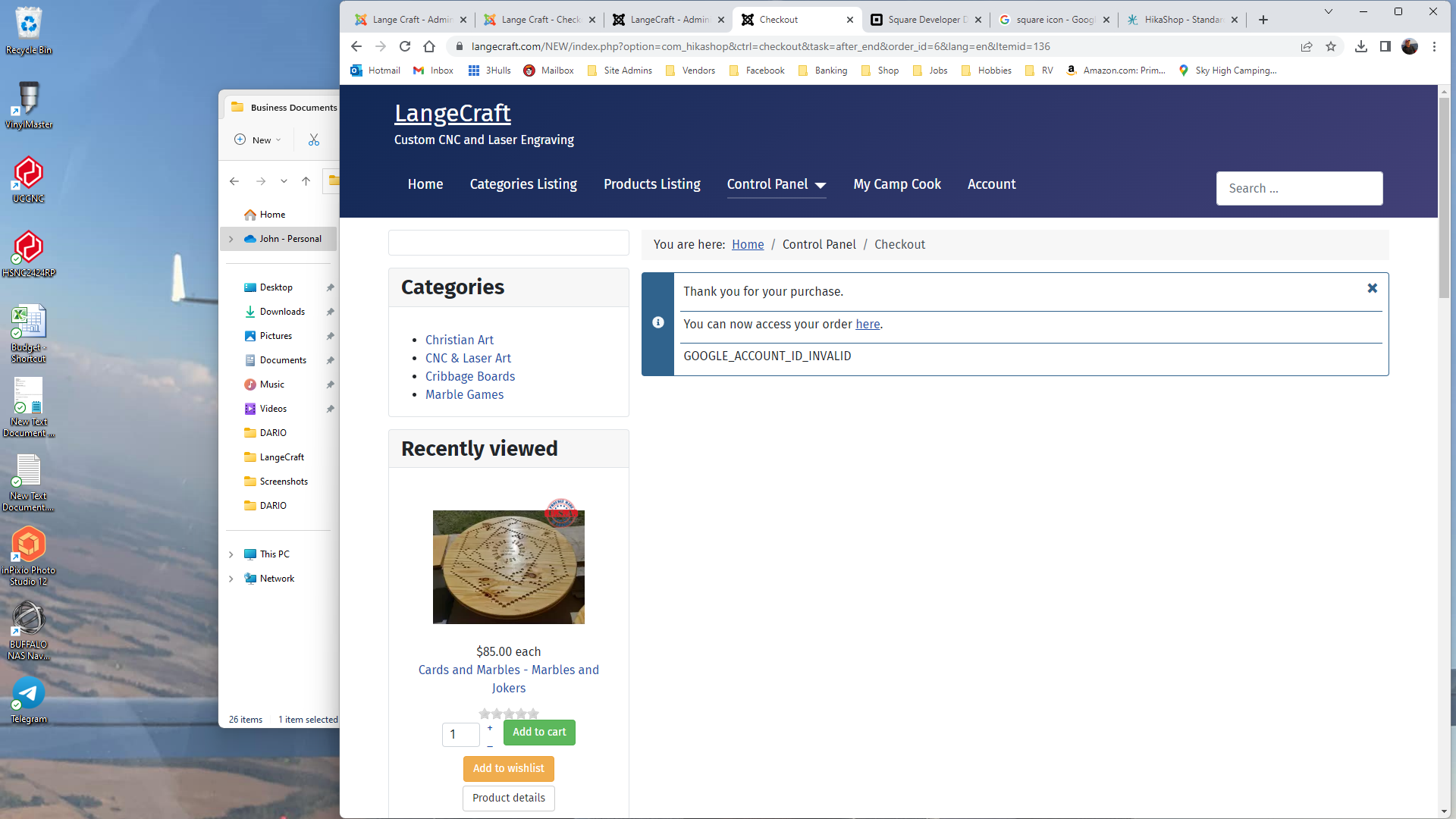 Returned to my site with Thank You and the error message