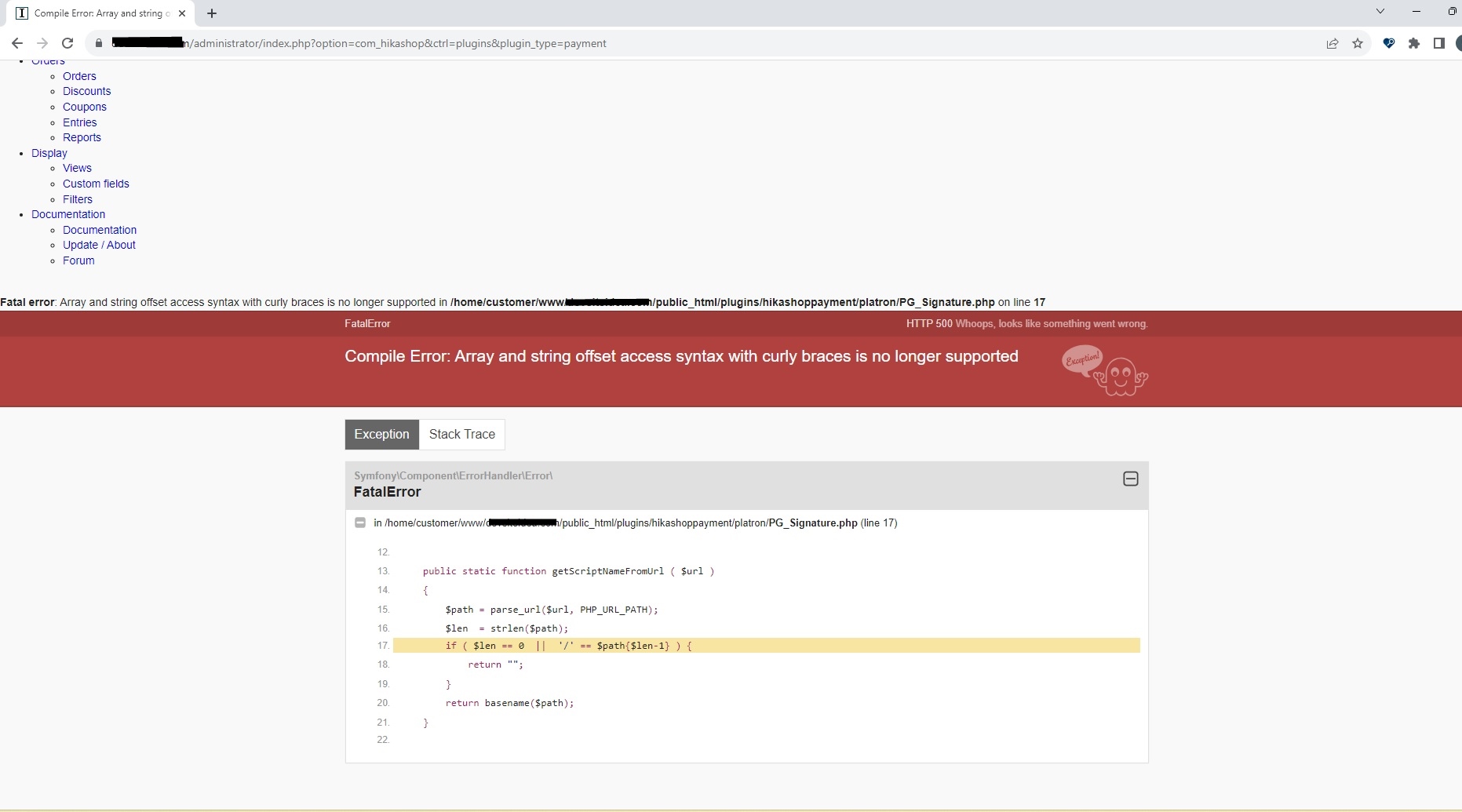 I am trying to add a new payment method. When I click on the New button under System -> Payment methods I get a fatal error. With maximum reporting on the error says: Compile Error: Array and string offset access syntax with curly braces is no longer supported and this error is happening in plugins/hikashoppayment/platron/PG_Signature.php (line 17). I have attached a screen shot.