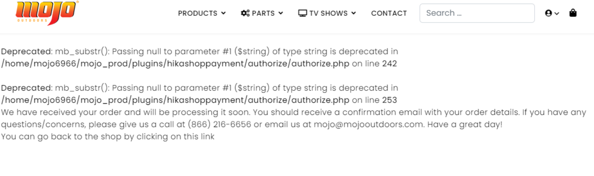 [Wed Sep 27 14:03:31.081725 2023] [fcgid:warn] [pid 133211:tid 140657877489408] [client XXX] mod_fcgid: stderr: PHP Deprecated: mb_substr(): Passing null to parameter #1 ($string) of type string is deprecated in /home/mojo6966/mojo_prod/plugins/hikashoppayment/authorize/authorize.php on line 253, referer: https://www.mojooutdoors.com/checkout/cid-3