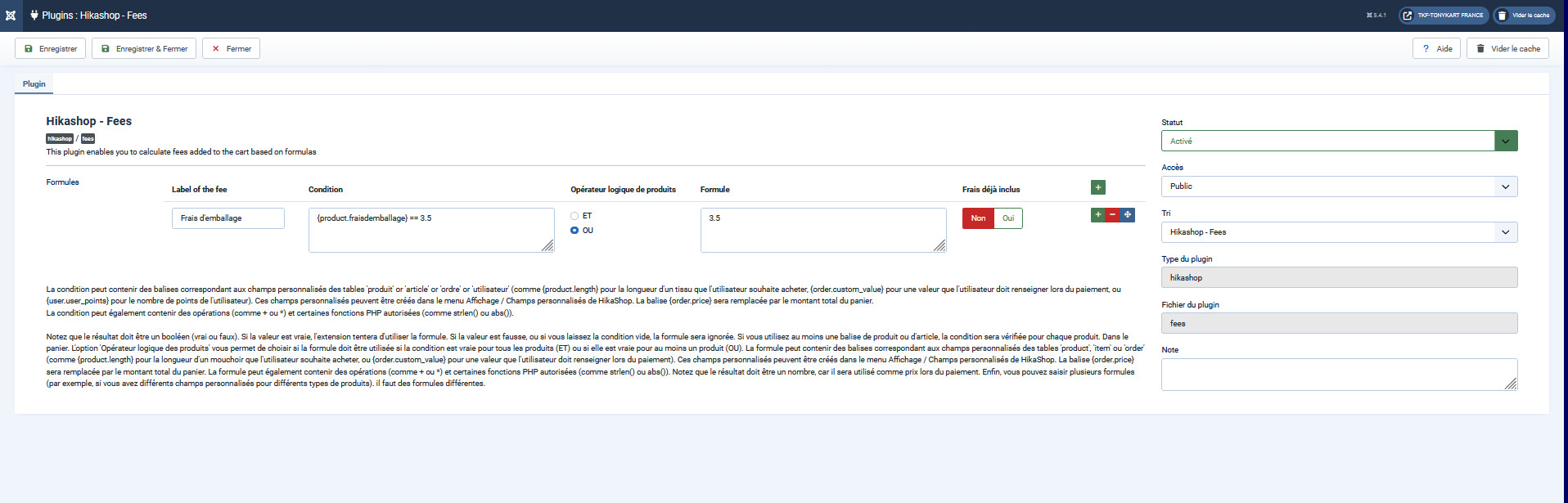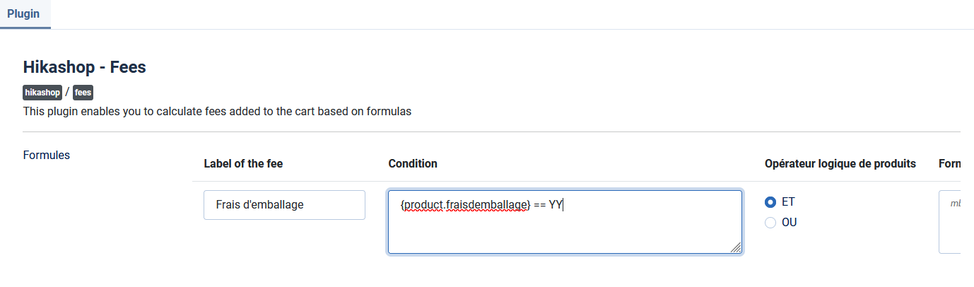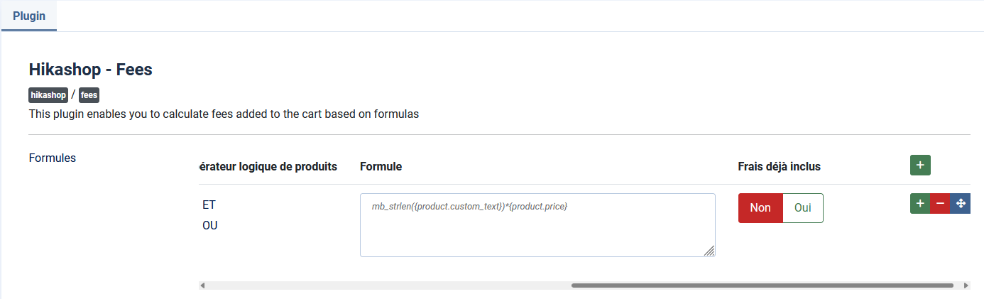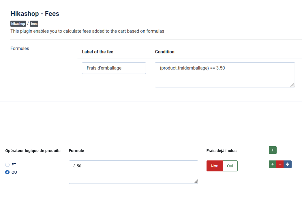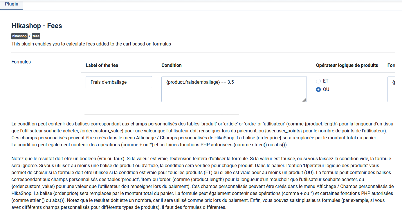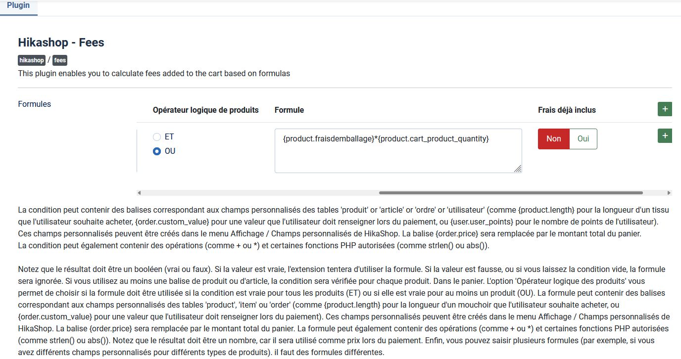 Ainsi, pour chaque produit du panier, les tags de la formule seront remplacés par leur valeur pour le produit en question, la valeur sera calculée, et ensuite la somme de toutes ces valeurs deviendra la valeur de la ligne de frais dans le panier.