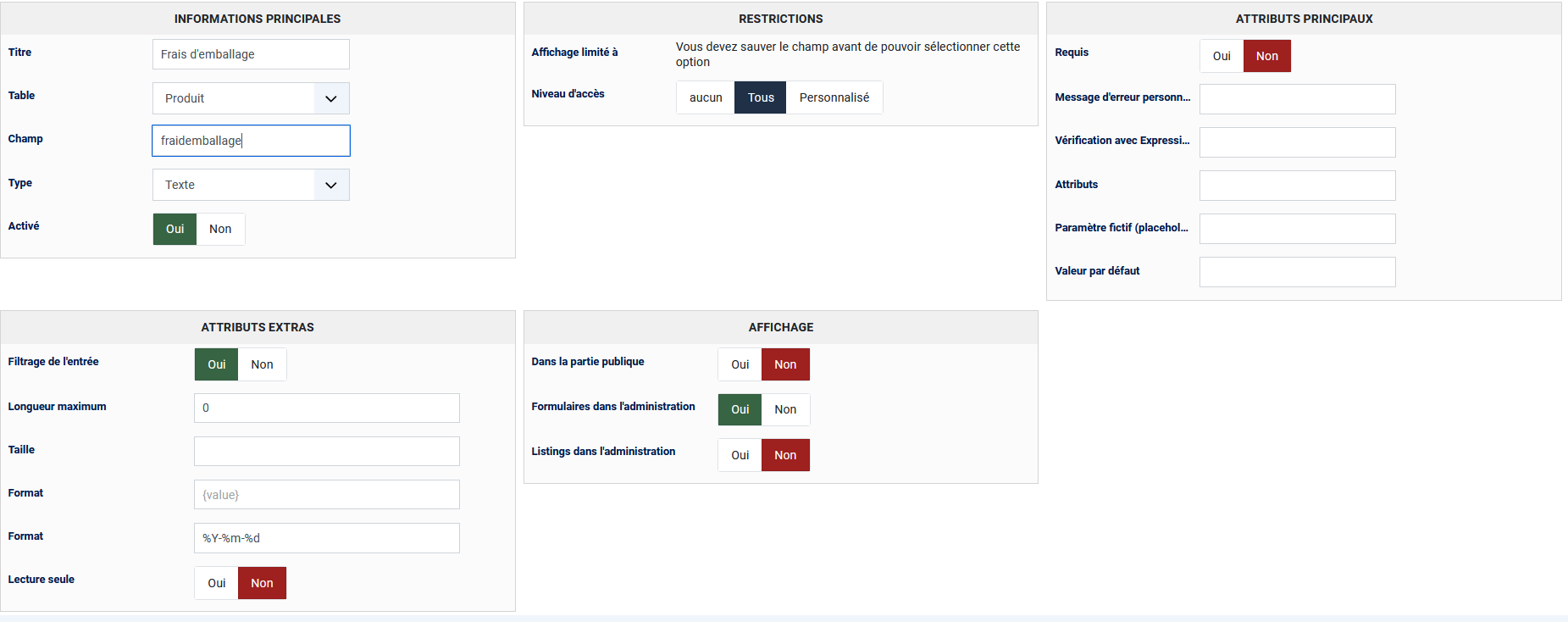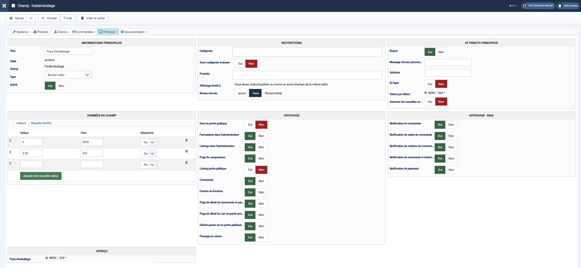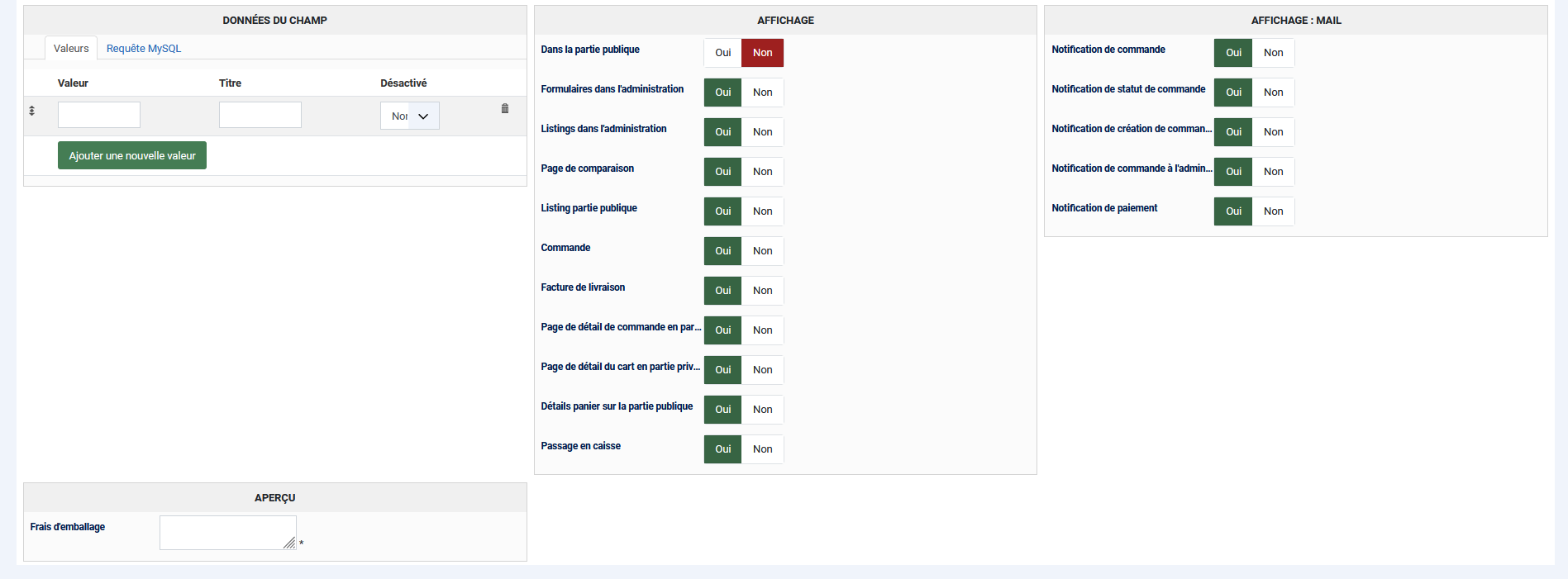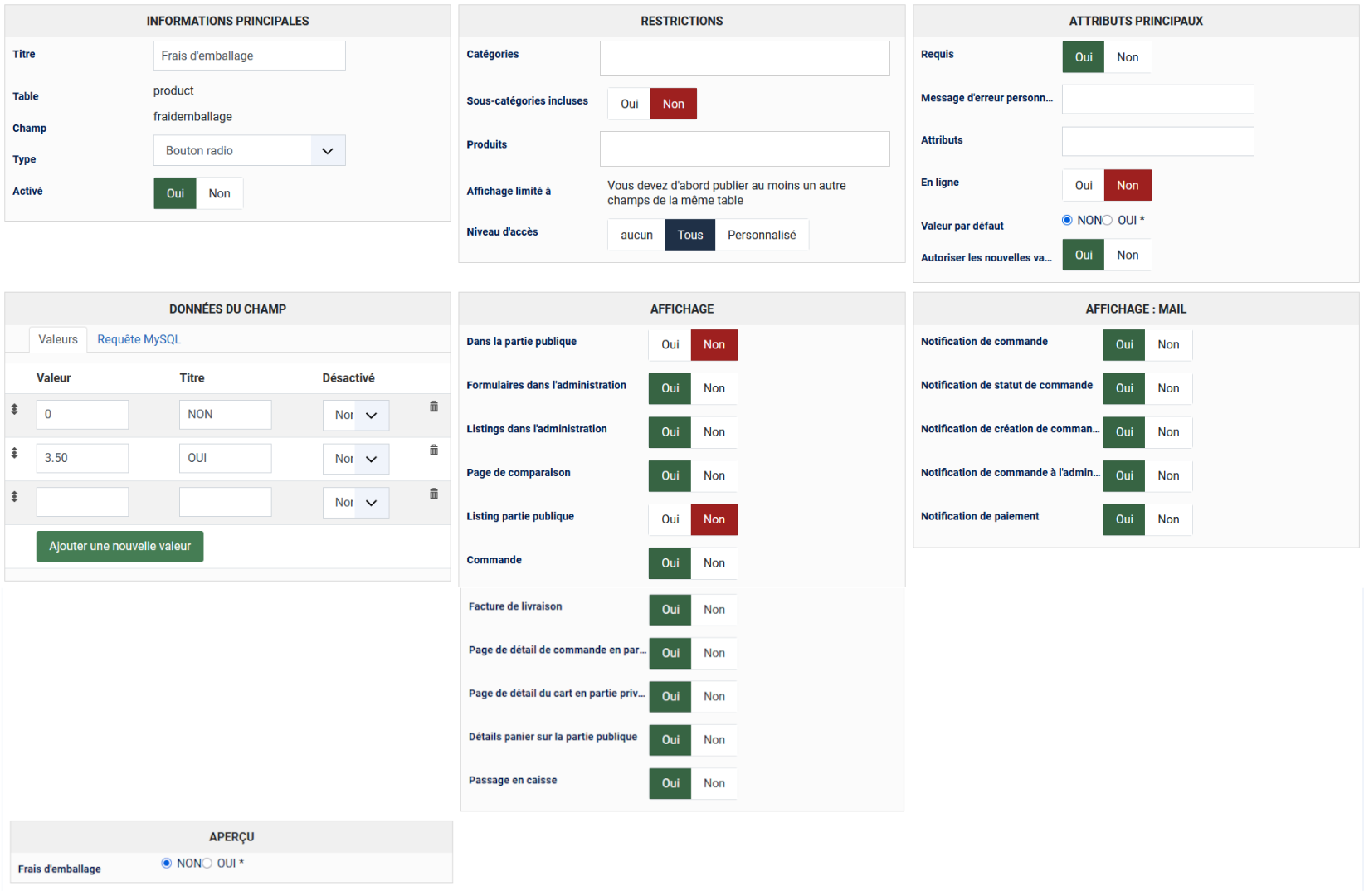 Si les frais d'emballage sont fixes pour tous les produits qui nécessitent des frais d'emballage, vous pouvez utiliser un champ de type "radio" avec les valeurs :