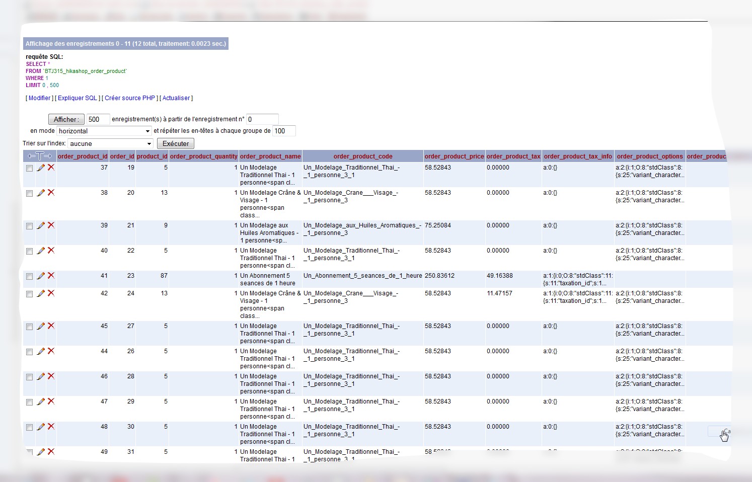 Il est donc intéressant de vérifier dans la base de donnée que la colonne "order_product_tax" contient bien la taxe pour le produit.