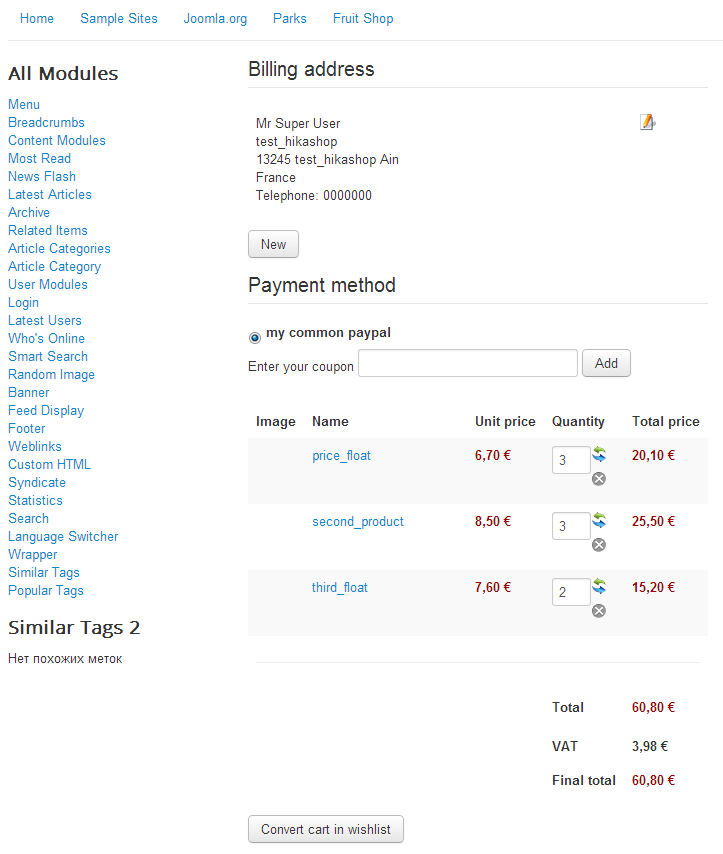 Please see the 2 attached screenshots. Problem is that during the checkout process, when a buyer purchases 2 or more of the same product (which is very likely), the total amount is shown wrongly during checkout. Just by a few cents. It looks like hikashop is taking the pre-tax price, multiplying it by the number ordered and then adding the tax back on, rather than just multiplying the tax-included price. (see screenshot 1). It's only out by a few cents, but it looks stupid, like I don't know how to calculate. Strangely, the e-mail confirmation of the order (see screenshot 2) is fine. How can I get the price shown during checkout to look the same as the correct price on the confirmation e-mail?