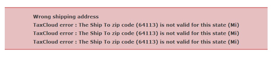 -- Error-message(debug-mod must be tuned on) -- : TaxCloud error : The Ship To zip code (XXXXX) is not valid for this state (XX)