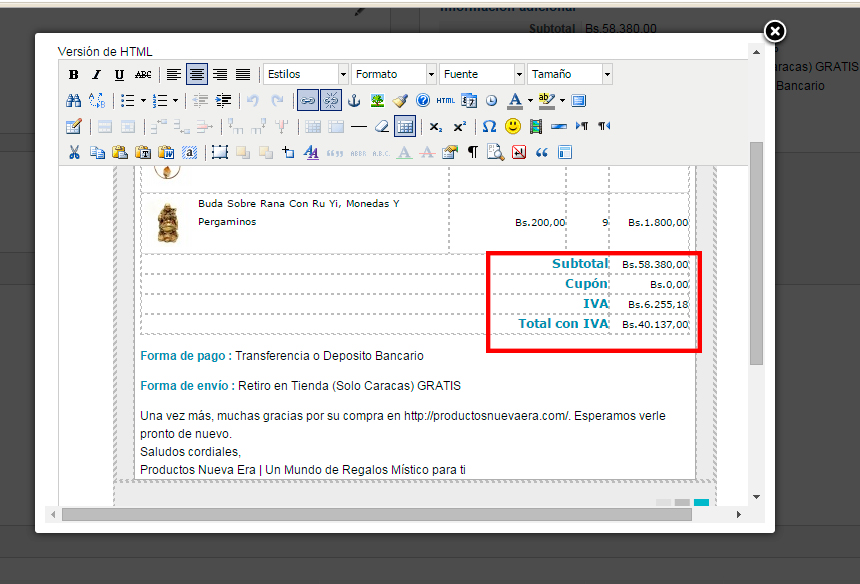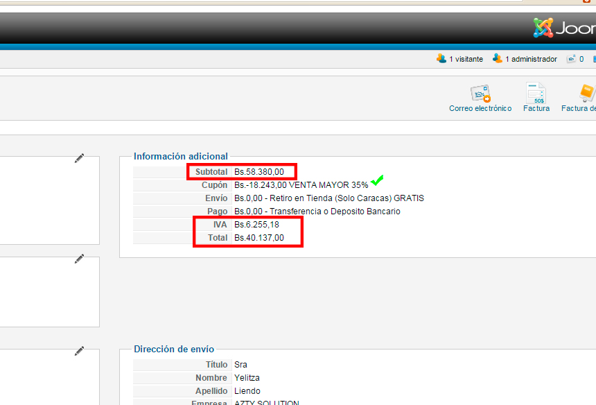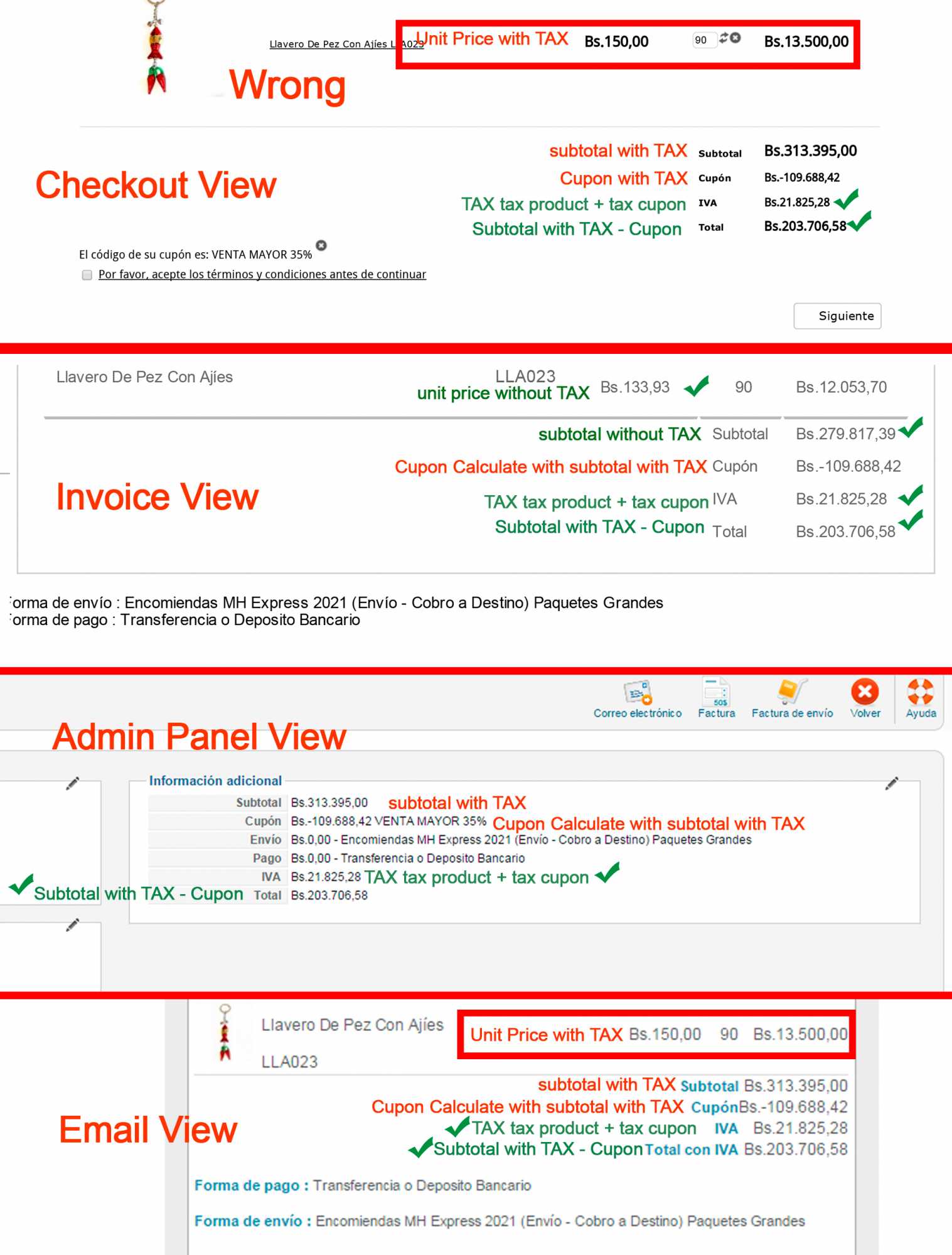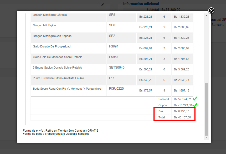 Subtotal excluding VAT Bs. 52.124,82 - Coupon Bs.-18.243,00