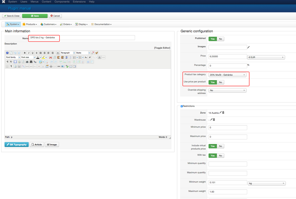 Neto: 6,25€ + 10% Tax = 6,88€