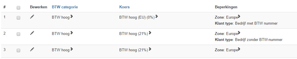 1 BTW hoog BTW hoog (EU) (0%) Zone: Europe Klant type: Company with VAT nummer