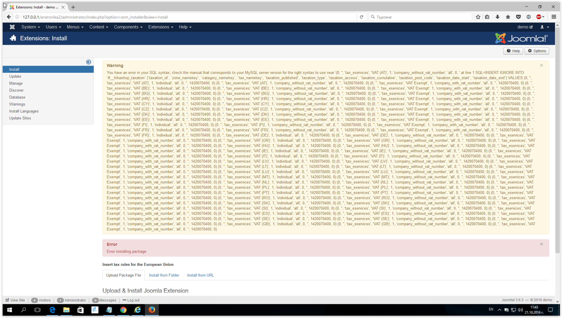You have an error in your SQL syntax; check the manual that corresponds to your MySQL server version for the right syntax to use near '(0, '', 'tax_eservices', 'VAT (AT)', 1, 'company_without_vat_number', 'all', 0, ' at line 1 SQL=INSERT IGNORE INTO `#__hikashop_taxation` (`taxation_id`, `zone_namekey`, `category_namekey`, `tax_namekey`, `taxation_published`, `taxation_type`, `taxation_access`, `taxation_cumulative`, `taxation_post_code`, `taxation_date_start`, `taxation_date_end`) VALUES (0, '', 'tax_eservices', 'VAT (AT)', 1, 'individual', 'all', 0, '', 1420070400, 0) (0, '', 'tax_eservices', 'VAT (AT)', 1, 'company_without_vat_number', 'all', 0, '', 1420070400, 0) (0, '', 'tax_eservices', 'VAT Exempt', 1, 'company_with_vat_number', 'all', 0, '', 1420070400, 0) (0, '', 'tax_eservices', 'VAT (BE)', 1, 'individual', 'all', 0, '', 1420070400, 0) (0, '', 'tax_eservices', 'VAT (BE)', 1, 'company_without_vat_number', 'all', 0, '', 1420070400, 0) (0, '', 'tax_eservices', 'VAT Exempt', 1, 'company_with_vat_number', 'all', 0, '', 1420070400, 0) (0, '', 'tax_eservices', 'VAT (BG)', 1, 'individual', 'all', 0, '', 1420070400, 0) (0, '', 'tax_eservices', 'VAT (BG)', 1, 'company_without_vat_number', 'all', 0, '', 1420070400, 0) (0, '', 'tax_eservices', 'VAT Exempt', 1, 'company_with_vat_number', 'all', 0, '', 1420070400, 0) (0, '', 'tax_eservices', 'VAT (HR)', 1, 'individual', 'all', 0, '', 1420070400, 0) (0, '', 'tax_eservices', 'VAT (HR)', 1, 'company_without_vat_number', 'all', 0, '', 1420070400, 0) (0, '', 'tax_eservices', 'VAT Exempt', 1, 'company_with_vat_number', 'all', 0, '', 1420070400, 0) (0, '', 'tax_eservices', 'VAT (CY)', 1, 'individual', 'all', 0, '', 1420070400, 0) (0, '', 'tax_eservices', 'VAT (CY)', 1, 'company_without_vat_number', 'all', 0, '', 1420070400, 0) (0, '', 'tax_eservices', 'VAT Exempt', 1, 'company_with_vat_number', 'all', 0, '', 1420070400, 0) (0, '', 'tax_eservices', 'VAT (CZ)', 1, 'individual', 'all', 0, '', 1420070400, 0) (0, '', 'tax_eservices', 'VAT (CZ)', 1, 'company_without_vat_number', 'all', 0, '', 1420070400, 0) (0, '', 'tax_eservices', 'VAT Exempt', 1, 'company_with_vat_number', 'all', 0, '', 1420070400, 0) (0, '', 'tax_eservices', 'VAT (DK)', 1, 'individual', 'all', 0, '', 1420070400, 0) (0, '', 'tax_eservices', 'VAT (DK)', 1, 'company_without_vat_number', 'all', 0, '', 1420070400, 0) (0, '', 'tax_eservices', 'VAT Exempt', 1, 'company_with_vat_number', 'all', 0, '', 1420070400, 0) (0, '', 'tax_eservices', 'VAT (EE)', 1, 'individual', 'all', 0, '', 1420070400, 0) (0, '', 'tax_eservices', 'VAT (EE)', 1, 'company_without_vat_number', 'all', 0, '', 1420070400, 0) (0, '', 'tax_eservices', 'VAT Exempt', 1, 'company_with_vat_number', 'all', 0, '', 1420070400, 0) (0, '', 'tax_eservices', 'VAT (FI)', 1, 'individual', 'all', 0, '', 1420070400, 0) (0, '', 'tax_eservices', 'VAT (FI)', 1, 'company_without_vat_number', 'all', 0, '', 1420070400, 0) (0, '', 'tax_eservices', 'VAT Exempt', 1, 'company_with_vat_number', 'all', 0, '', 1420070400, 0) (0, '', 'tax_eservices', 'VAT (FR)', 1, 'individual', 'all', 0, '', 1420070400, 0) (0, '', 'tax_eservices', 'VAT (FR)', 1, 'company_without_vat_number', 'all', 0, '', 1420070400, 0) (0, '', 'tax_eservices', 'VAT Exempt', 1, 'company_with_vat_number', 'all', 0, '', 1420070400, 0) (0, '', 'tax_eservices', 'VAT (FR)', 1, 'individual', 'all', 0, '', 1420070400, 0) (0, '', 'tax_eservices', 'VAT (DE)', 1, 'individual', 'all', 0, '', 1420070400, 0) (0, '', 'tax_eservices', 'VAT (DE)', 1, 'company_without_vat_number', 'all', 0, '', 1420070400, 0) (0, '', 'tax_eservices', 'VAT Exempt', 1, 'company_with_vat_number', 'all', 0, '', 1420070400, 0) (0, '', 'tax_eservices', 'VAT (GR)', 1, 'individual', 'all', 0, '', 1420070400, 0) (0, '', 'tax_eservices', 'VAT (GR)', 1, 'company_without_vat_number', 'all', 0, '', 1420070400, 0) (0, '', 'tax_eservices', 'VAT Exempt', 1, 'company_with_vat_number', 'all', 0, '', 1420070400, 0) (0, '', 'tax_eservices', 'VAT (HU)', 1, 'individual', 'all', 0, '', 1420070400, 0) (0, '', 'tax_eservices', 'VAT (HU)', 1, 'company_without_vat_number', 'all', 0, '', 1420070400, 0) (0, '', 'tax_eservices', 'VAT Exempt', 1, 'company_with_vat_number', 'all', 0, '', 1420070400, 0) (0, '', 'tax_eservices', 'VAT (IE)', 1, 'individual', 'all', 0, '', 1420070400, 0) (0, '', 'tax_eservices', 'VAT (IE)', 1, 'company_without_vat_number', 'all', 0, '', 1420070400, 0) (0, '', 'tax_eservices', 'VAT Exempt', 1, 'company_with_vat_number', 'all', 0, '', 1420070400, 0) (0, '', 'tax_eservices', 'VAT (IT)', 1, 'individual', 'all', 0, '', 1420070400, 0) (0, '', 'tax_eservices', 'VAT (IT)', 1, 'company_without_vat_number', 'all', 0, '', 1420070400, 0) (0, '', 'tax_eservices', 'VAT Exempt', 1, 'company_with_vat_number', 'all', 0, '', 1420070400, 0) (0, '', 'tax_eservices', 'VAT (LV)', 1, 'individual', 'all', 0, '', 1420070400, 0) (0, '', 'tax_eservices', 'VAT (LV)', 1, 'company_without_vat_number', 'all', 0, '', 1420070400, 0) (0, '', 'tax_eservices', 'VAT Exempt', 1, 'company_with_vat_number', 'all', 0, '', 1420070400, 0) (0, '', 'tax_eservices', 'VAT (LT)', 1, 'individual', 'all', 0, '', 1420070400, 0) (0, '', 'tax_eservices', 'VAT (LT)', 1, 'company_without_vat_number', 'all', 0, '', 1420070400, 0) (0, '', 'tax_eservices', 'VAT Exempt', 1, 'company_with_vat_number', 'all', 0, '', 1420070400, 0) (0, '', 'tax_eservices', 'VAT (LU)', 1, 'individual', 'all', 0, '', 1420070400, 0) (0, '', 'tax_eservices', 'VAT (LU)', 1, 'company_without_vat_number', 'all', 0, '', 1420070400, 0) (0, '', 'tax_eservices', 'VAT Exempt', 1, 'company_with_vat_number', 'all', 0, '', 1420070400, 0) (0, '', 'tax_eservices', 'VAT (MT)', 1, 'individual', 'all', 0, '', 1420070400, 0) (0, '', 'tax_eservices', 'VAT (MT)', 1, 'company_without_vat_number', 'all', 0, '', 1420070400, 0) (0, '', 'tax_eservices', 'VAT Exempt', 1, 'company_with_vat_number', 'all', 0, '', 1420070400, 0) (0, '', 'tax_eservices', 'VAT (NL)', 1, 'individual', 'all', 0, '', 1420070400, 0) (0, '', 'tax_eservic