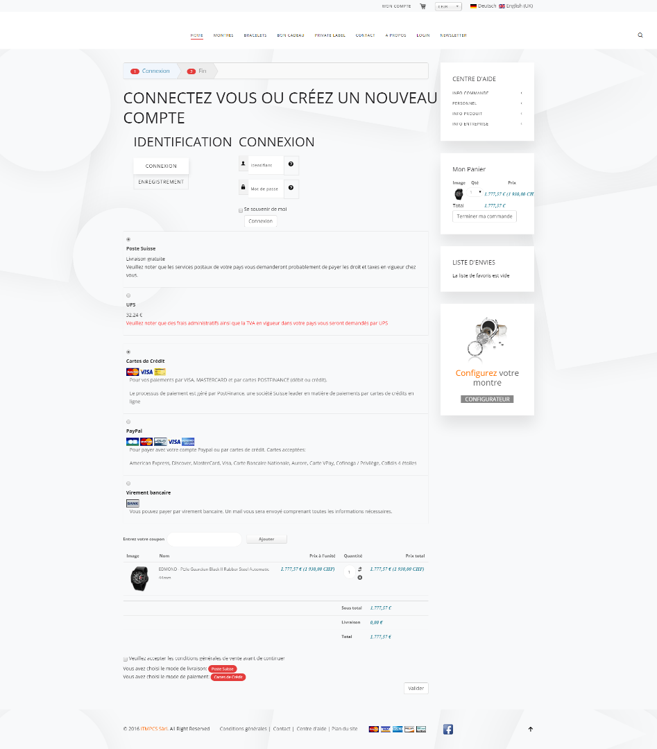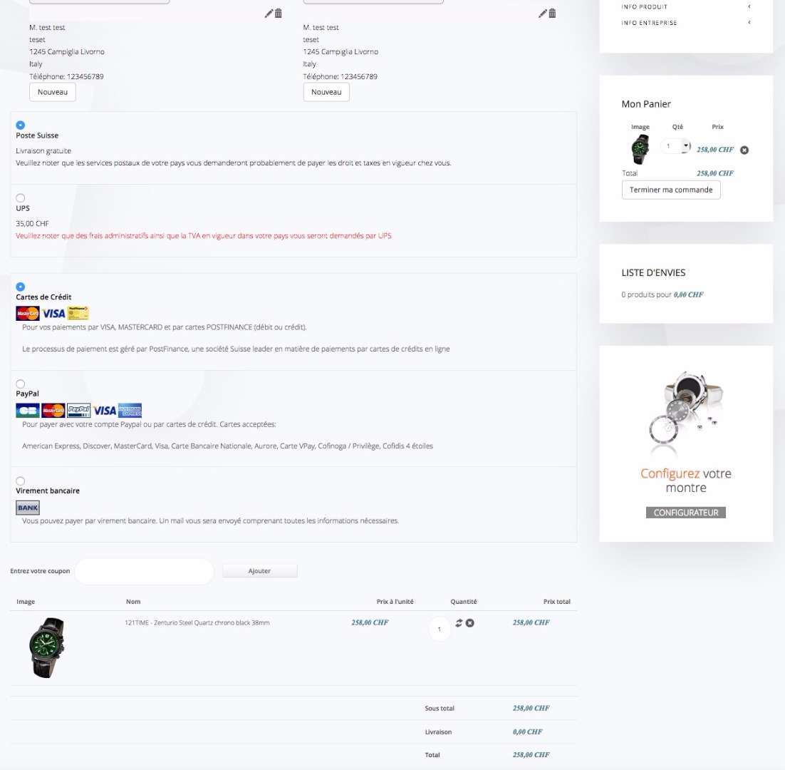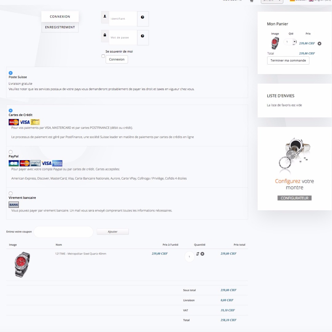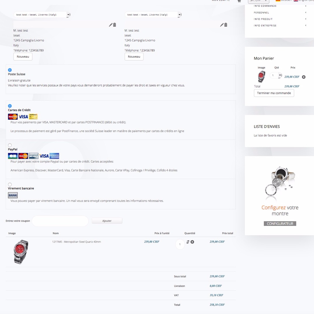 Further we propose an UPS shipment option when a product must be shipped abroad. If it is shipped within Switzerland, only SwissPost option is proposed and the 8% VAT is added to the cost of the product