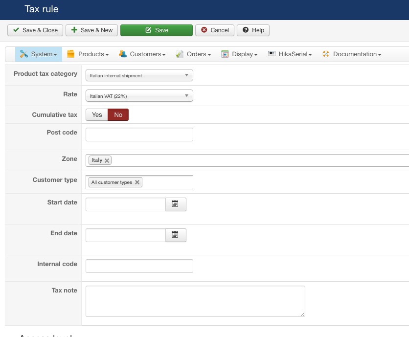 We created the 3 tax rules: Swiss 8% VAT, another rule with 0% VAT and an Italian tax rule with 22% VAT.