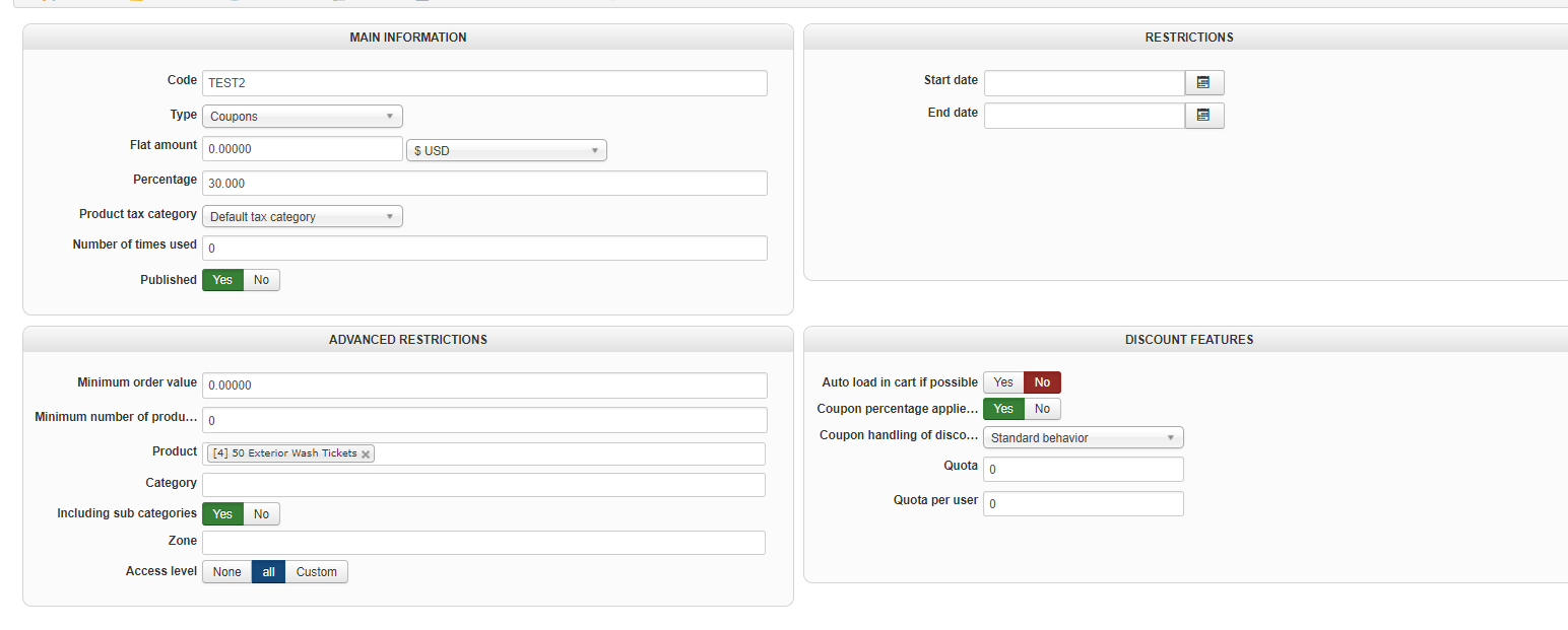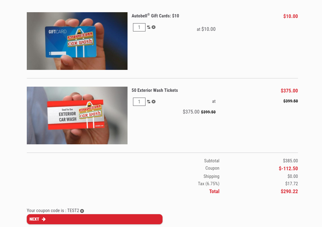 Below is the correct calculation and price. Of the 2 items in the cart only the 50 Exterior wash tickets has a coupon of 30% and it is also the only item that is taxable amount of 6.75% of the 2 items in the cart. This is also with the "auto load in cart if possible" is turned off.