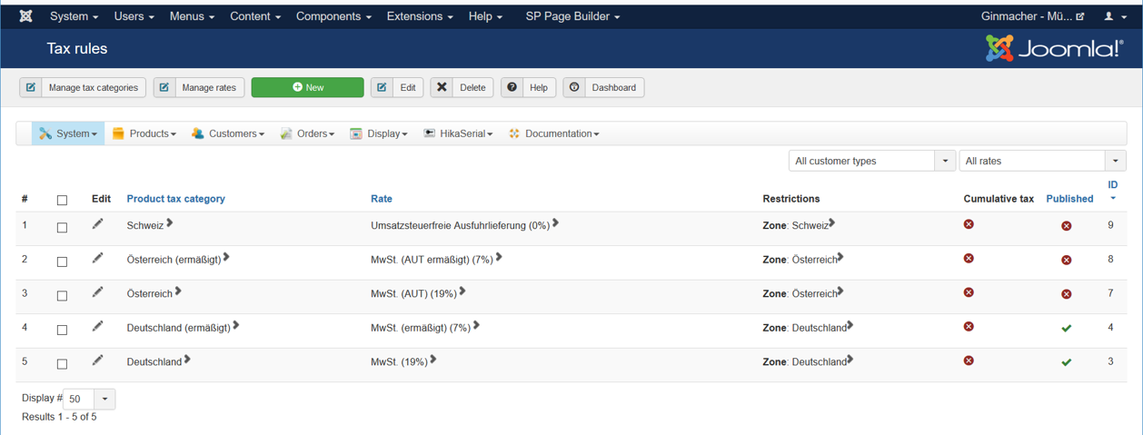 I set up 5 different tax rules based on the zones Germany (19% and 7%), Austria with the same (19% and 7%) and Switzerland (0%). These tax rules I need to selling to those countries from Germany. I set up everything correctlly as tax rates etc. (see screenshot):