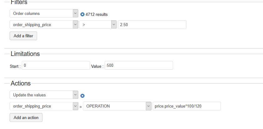 Note that thanks to the "Limitations" area of the mass action, it will by default only process the 500 first products. So you can process the mass action several times, each time incrementing the "start" field by the value in the "value" input field so that you'll cover all the products.